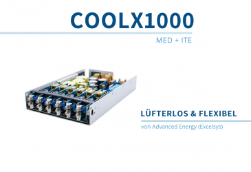 Die CoolX1000 Serie von Advanced Energy (Excelsys) erreicht ohne Lüfter, rein konvektionsgekühlt bis zu 1000 Watt Ausgangsleistung. Das kompakte Grundgerät lässt sich mit sechs Ausgangsmodulen bestücken und ermöglicht bis zu zwölf isolierte Ausgangsspannungen, variierend von 2,5-58 Volt.